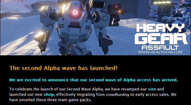 BETA ACCESS HOLDERS: If you previously purchased a pledge level which includes Beta access, you will be now be granted Alpha access too. A separate email will go out to you with instructions. If you have not received this email, please contact support@heavygear.com.