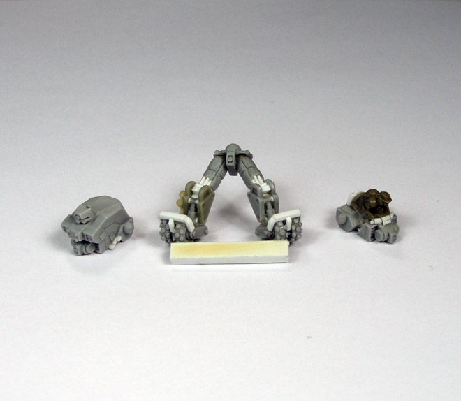 Phil has been busy working on the Northern Lynx infantry support Gear. The Lynx is a special Gear it has a normal walker mode, but for its ground mode it transforms into a Bike. Below is an image with line art of the Lynx in both modes plus the small styrene and resin master parts that Phil has finished up so far.