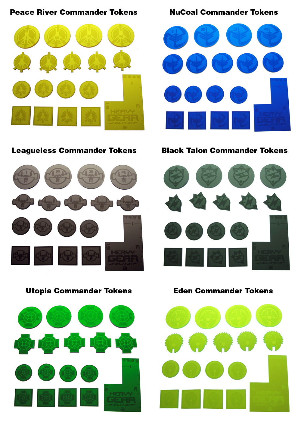 Each Commander Tokens Pack include 17 laser etched and cut color acrylic tokens with the faction logos, plus 1 Heavy Gear Blitz Measuring Tool also in the same color acrylic (see images below for contents). Each Includes four numbered (1 to 4) 40mm round Objective token markers, five close cut 30mm Victory Point tokens, four 25mm round Command Point tokens (C for Command Point and Circle shape), four 25mm square Skill Point tokens (S for Skill Point and Square shape), and one Heavy Gear Blitz Measuring Tool for fast 0.5", 1", 1.5", 2", and 3" measurements.