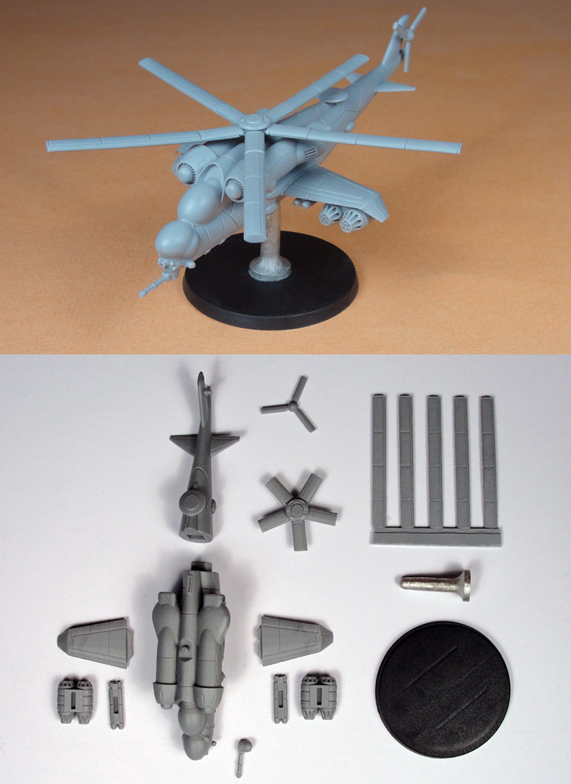 The new Titan Attack Helicopter (VTOL Aircraft) for the Southern faction of Heavy Gear Blitz is now available to order on the Dream Pod 9 Online Store. Alain over at Fusion Models finished up the Titan production molds the end of last week and ran the first few resin copies over the weekend. Attached is a photo of the assembled Titan unpainted resin, with a photo of all the parts included in the kit below it.