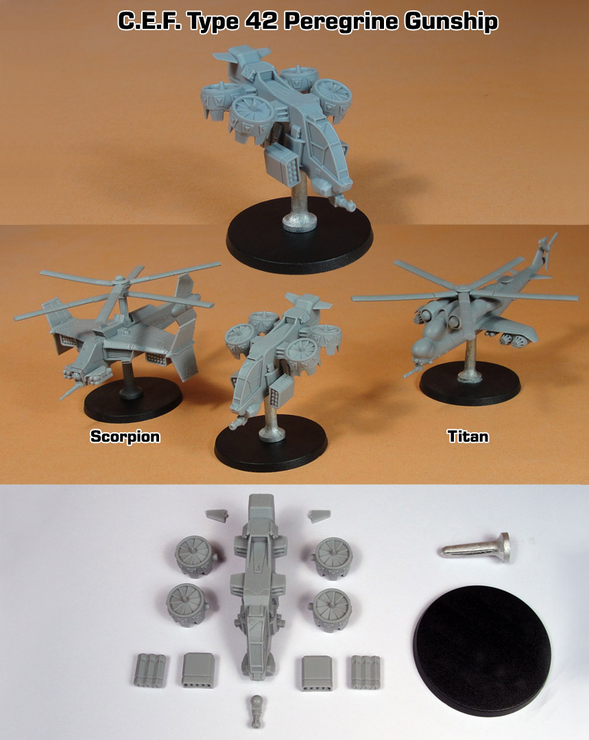 The new Type 42 Peregrine Gunship (VTOL Aircraft) for the C.E.F. faction of Heavy Gear Blitz is now available to order on the Dream Pod 9 Online Store. We received the first resin copies of the Type 42 from Fusion Models on Monday. Attached is a preview photo of the assembled unpainted resin Type 42 Peregrine Gunship with standard weapons loadout (top) and shown beside the Scorpion and Titan Attack Helicopters previously released. Preview also show all the Type 42 parts (bottom) including the anti-tank missiles upgrade variant parts.