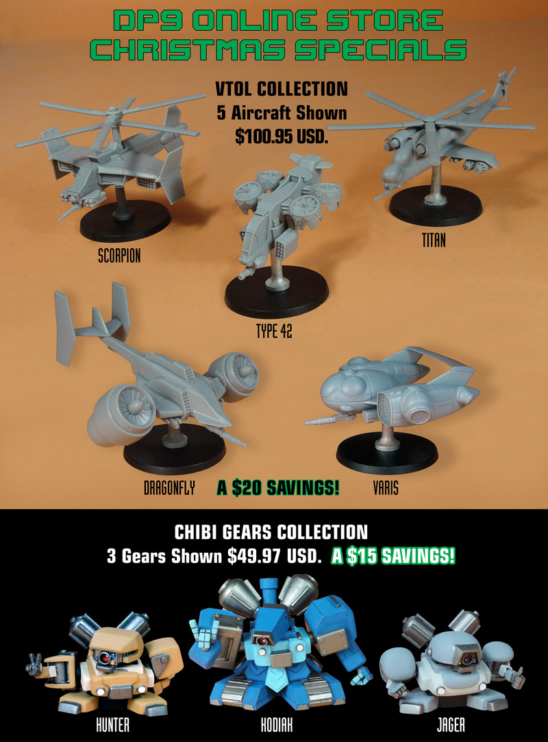 During the Christmas break we are adding two Christmas Specials to the online store. The first is for fans of our new high quality VTOL aircraft models, released over the last year. The VTOL Aircraft Collection includes 1 Dragonfly used by the Northern and Peace River factions, 1 Scorpion used by the North, 1 Varis used by the Southern and NuCoal factions, 1 Titan used by the South, and 1 Type 42 used by the CEF and PAK factions. All models are 1/144 scale cast in resin, with metal flight posts and 40mm round plastic bases. For the Christmas Special price of $100.95USD, a saving of $20. The second Christmas Special is for our Chibi Gear fans and includes 1 Chibi Hunter, 1 Chibi Kodiak, and 1 Chibi Jager cast in resin. For Christmas Special price of $49.97USD, a saving of $15.