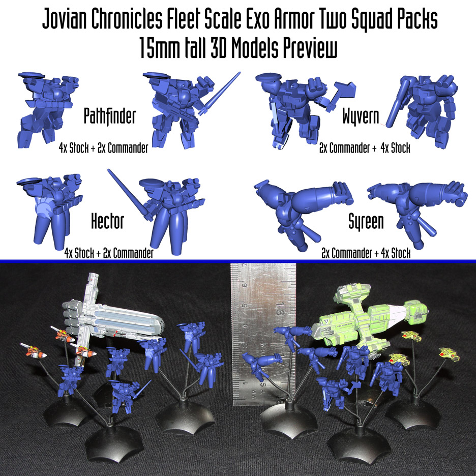 A cool treat today, Tony finished up the 3d models of the exo armors he was working on for Jovian Chronicles Fleet Scale. Checkout the image below of the of the small 15mm tall Wyvern, Syreen, Pathfinder, and Hector 3d models added to a photo of the existing Fleet Scale fighter squads, flight stands, spaceships, and a ruler for scale. He even made a commander models for each exo, so each squad base will have a commander and 2 stock models. Plus he gave the commanders different weapons and poses, the Wyvern commander got an axe and smaller main gun, the Syreen got a more dramatic pose with the shoulders swept back, the Pathfinder got a different gun plus a plasma lance, and the Hector got a plasma lance.