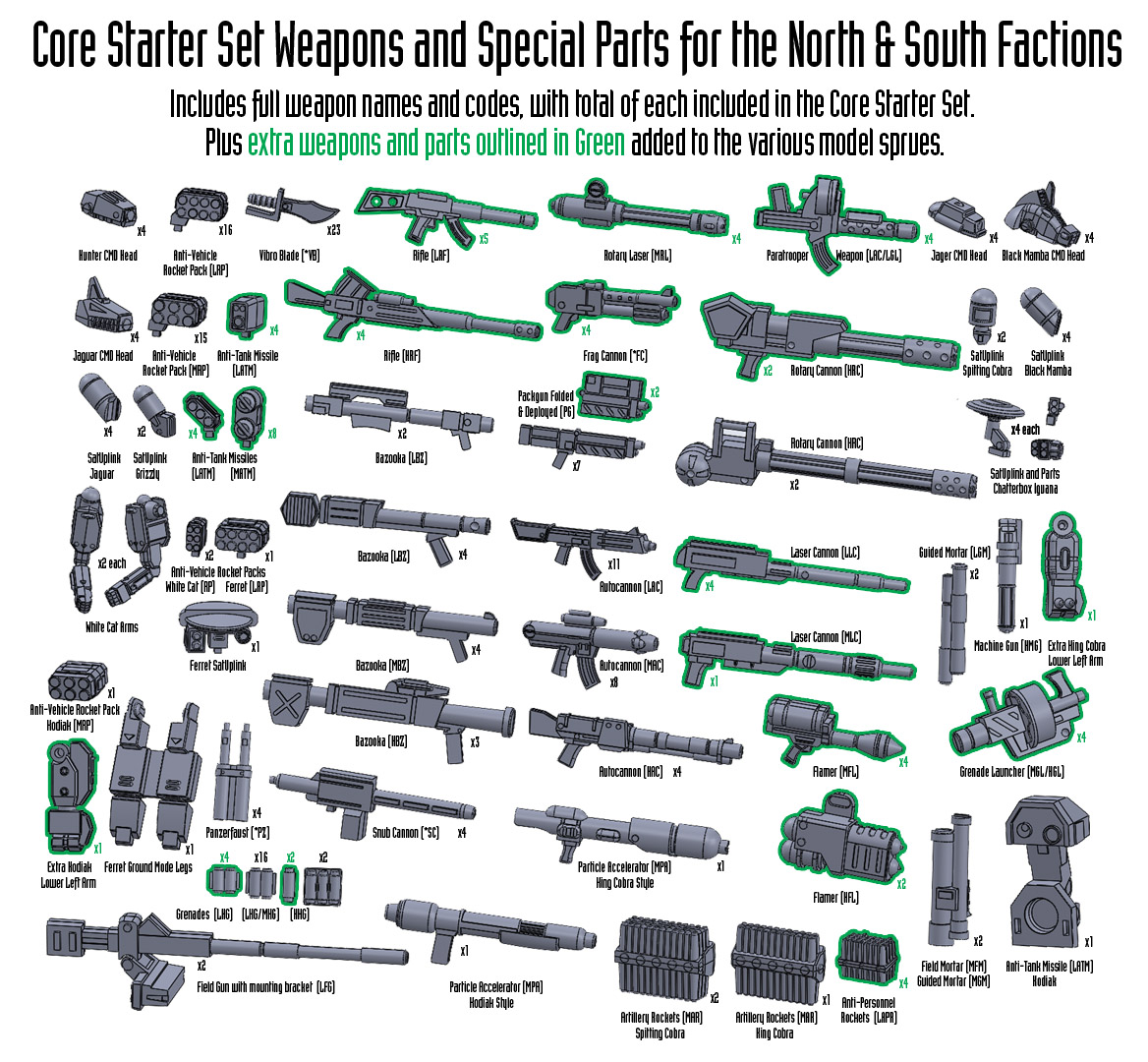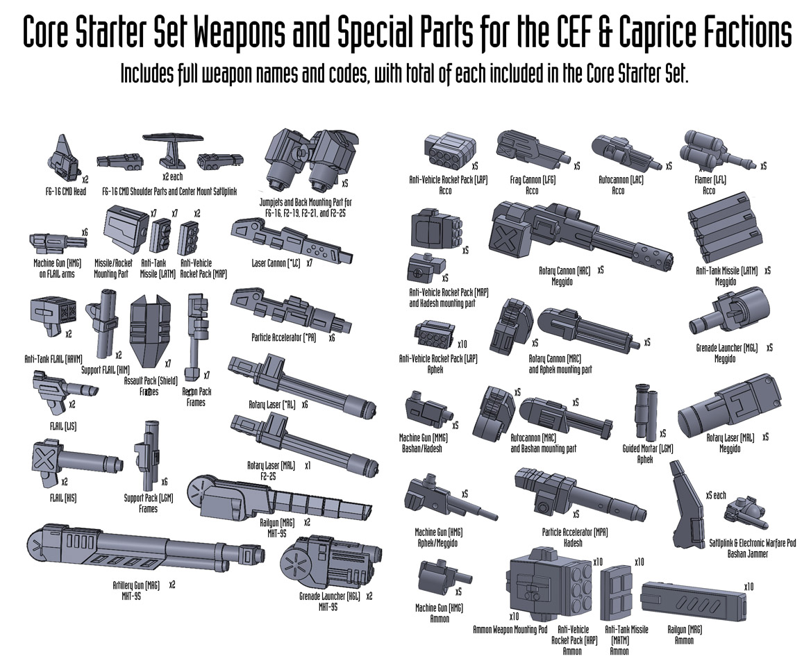 Home » Blog » Core Starter Set Weapons and Special Parts Core Starter Set Weapons and Special Parts February 11, 2016 Robert Dubois Off Our latest Kickstarter Update included the following images of the all the weapons and special parts included on the various model sprues in the Core Starter Set.