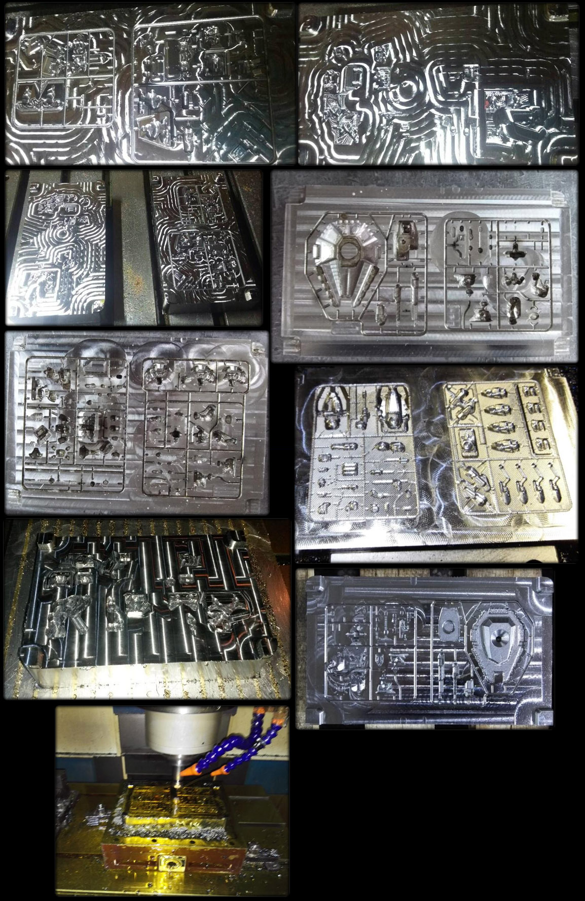 This week we have a progress update on the steel mold plates for the plastic injections molds. The company making the molds sent us some early progress photos of some of the steel mold plates. The image below shows the first step in making the molds plates, where they use a Computer Numerical Control (CNC) Machine is used to rough out the mold cavities. There is an photo of the CNC Machine cutting one of the mold plates at the bottom of the image. This removes most of the excess steel, but does not do the fine details in the parts cavities. Each mold will have 4 of these plates with two on each side to make the four plastic model sprues in the mold.