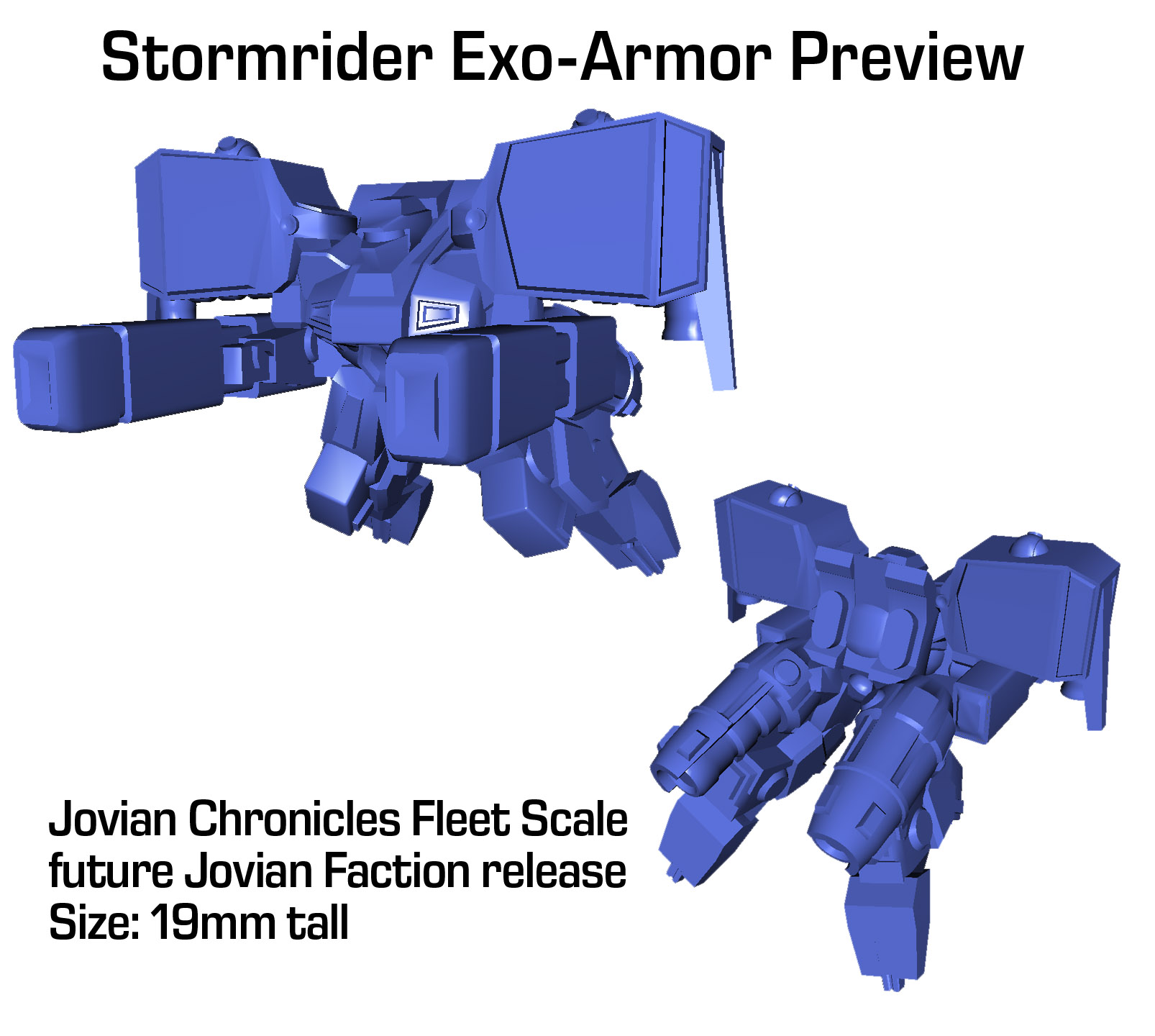 We mentioned in an earlier post that Tony had finished up some more 3d models for Jovian Chronicles Fleet Scale. The latest model is the Stormrider Exo-Armor for the Jovian Faction, with its massive fire power. The Stormrider miniature will be 19mm tall, where as the other JC Fleet Scale minis are about 15mm tall on average. Checkout the image below to see how it turned out.