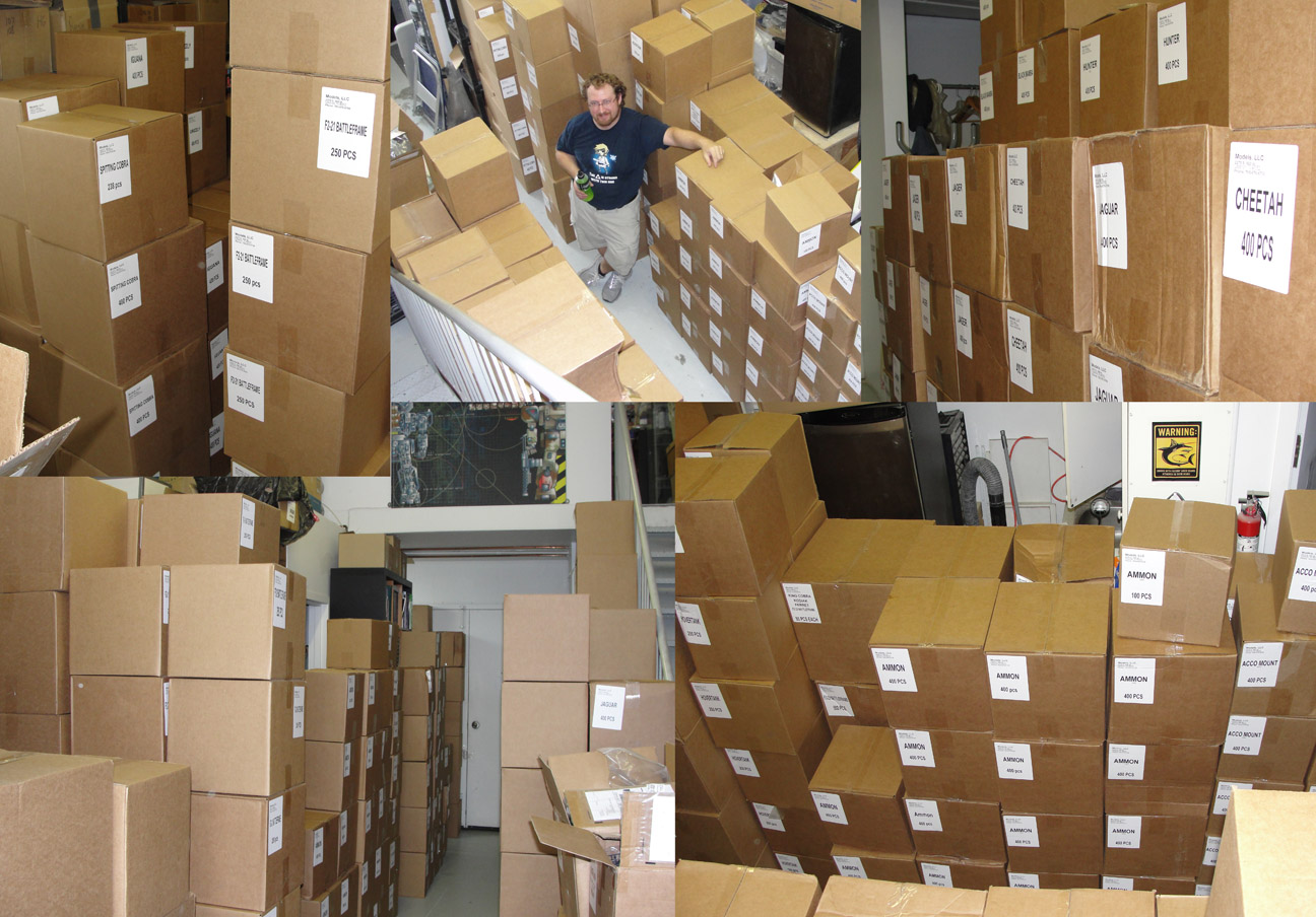FedEx Freight arrived at 9:45 am at our office here in Montreal and dropped off 7 skids of boxes with all the plastic model sprues for our Kickstarter backer reward packages and online pre-orders.
