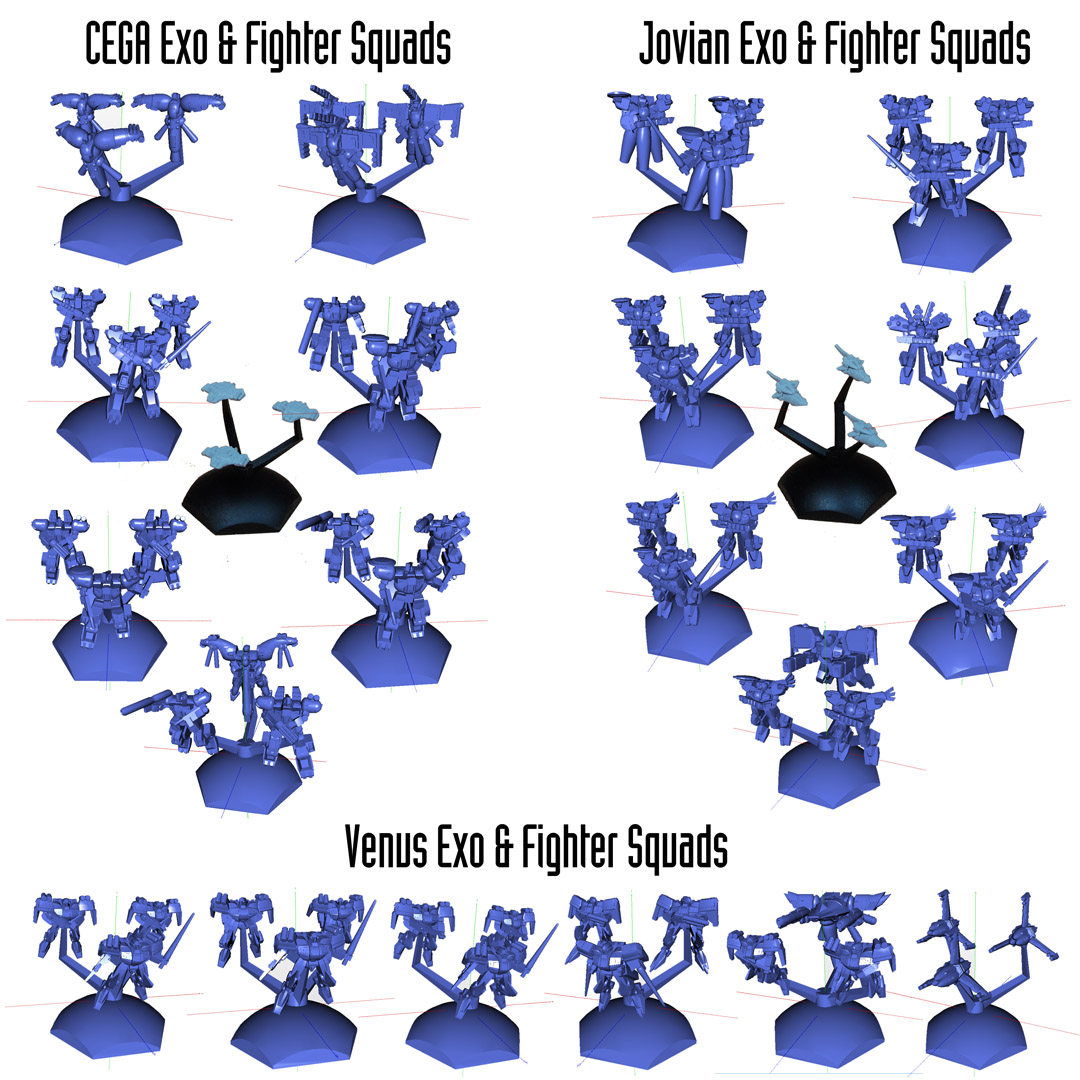 As part of the Kickstarter we'll have single CEGA and Jovian faction Exo-Armor and Fighter Squads available to take as Add-On Rewards for additional pledges. This is to allow Backers to get the individual Exo-Armor and Fighter squads they want, with the new 3 post pewter stands and black plastic base, all packaged in a small ziplock bag. That way we can lower the price and not force players to purchase the older, more expensive, 2 packs. And to that end we have removed the 2 Squad Packs from the DP9 Online Store and replace them all with the new Single Squads in small ziplock bags. We have also added the new 3 post stands to the online store for player that want to upgrade squads they may have with the older 3 pronged poseable stands. And we have kept the 3 pronged poseable stands available for purchase for those players who want to us them. We also added few new squad options like Wyvern Bomber and Marine squads for CEGA and Pathfinder Sniper and Recon squads for Jovian. The attached image shows all the squads now available. Here is a link to the Online Store to check them out.