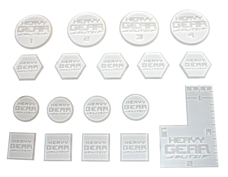 At the request of several players, with multiple faction armies, who wanted a generic set of Commander Tokens without any faction logos on them. We had our friends over at Impudent Mortal make a new Generic Commander Tokens Pack with the Heavy Gear Blitz logo instead of a faction logo on them. The pack includes 17 laser etched and cut clear acrylic tokens: four numbered (1 to 4) 40mm round Objective token markers, five 31mm hexagon Victory Point tokens, four 25mm round Command Point tokens (C for Command Point and Circle shape), four 25mm square Skill Point tokens (S for Skill Point and Square shape). Plus one Heavy Gear Blitz Measuring Tool for fast 0.5", 1", 1.5", 2", and 3" measurements, see the photo below to see how they all turned out.